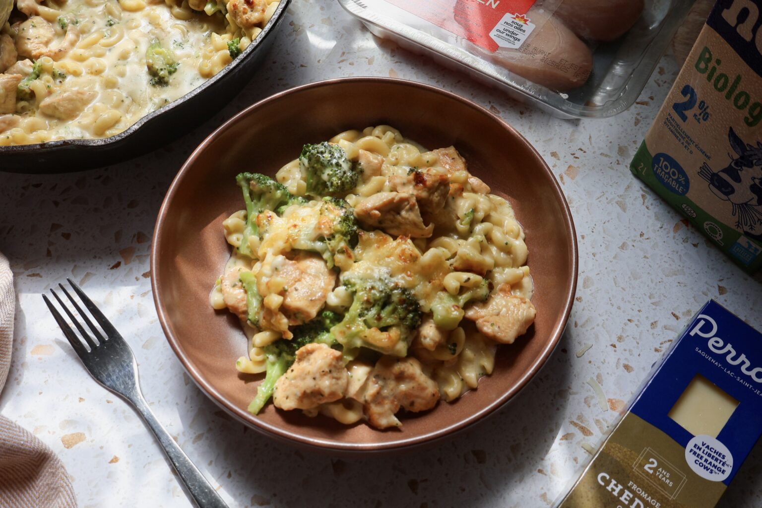 Macaroni crémeux au poulet, brocoli et cheddar fort